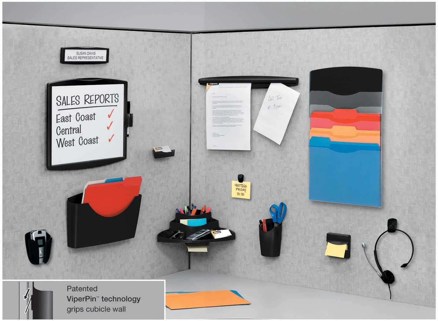 The Fellowes Partition Additions Waterfall Sorter is ideal for organizing your most important projects! Five transparent sleeves keep files visually accessible, while the stepped design makes it easy to organize and prioritize documents. Each sleeve holds up to 15 sheets and accommodates most document sizes. Sleeves are open at the top and a single side for ease of use. Patented ViperPin technology attaches to any tackable surface and securely holds up to 5 lbs. without damaging mounting surface. Mounts vertically or horizontally.
