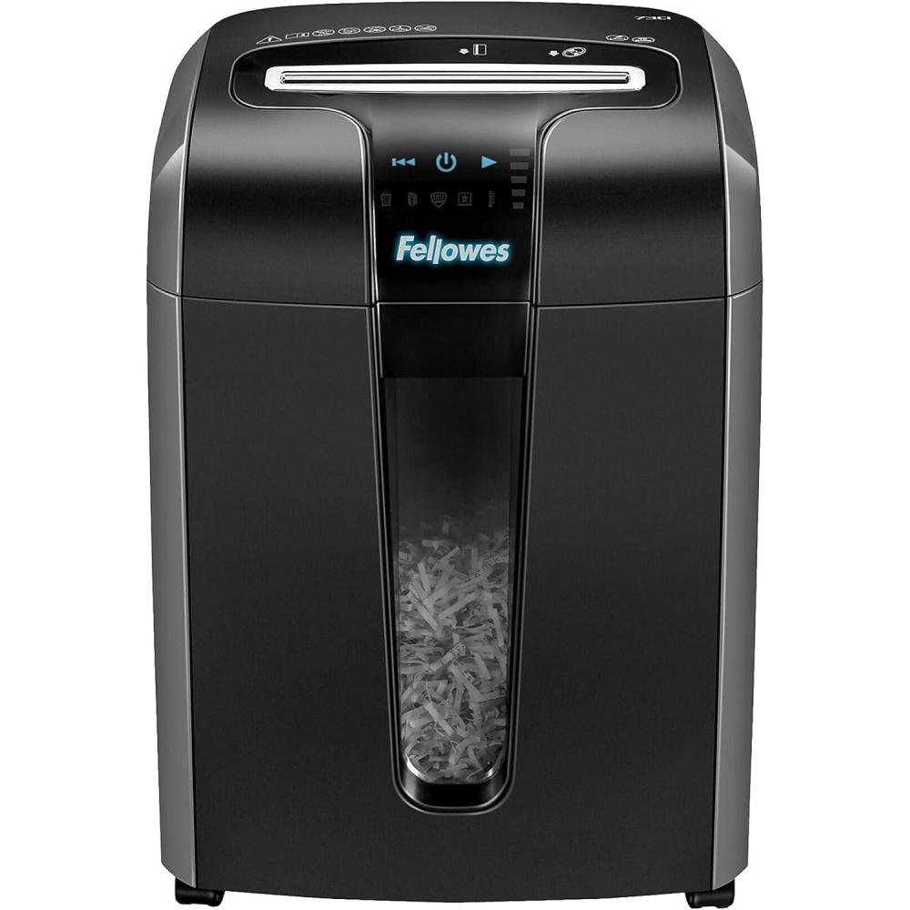 The Powershred 73Ci 100% Jam Proof Shredder features a 100% Jam Proof System that eliminates paper jams and powers through tough jobs. The patented Safe Sense Technology stops shredding when hands touch the paper opening. The Energy Savings System provides optimal energy efficiency 100% of the time -in use and out of use. The innovative touch screen technology features back-lit LEDs. The 73Ci shreds 12 sheets per pass into 5/32-Inch x 1-1/2-Inch cross-cut particles (Security Level 3). Shreds for up to 10 minutes before a 20 minute cool down period is needed. Features 6 gallon pull-out bin. 21.25-Inch x 15.5-Inch x 11.31-Inch. Includes 1 year product warranty and a 5 year cutter warranty. For 1 user.